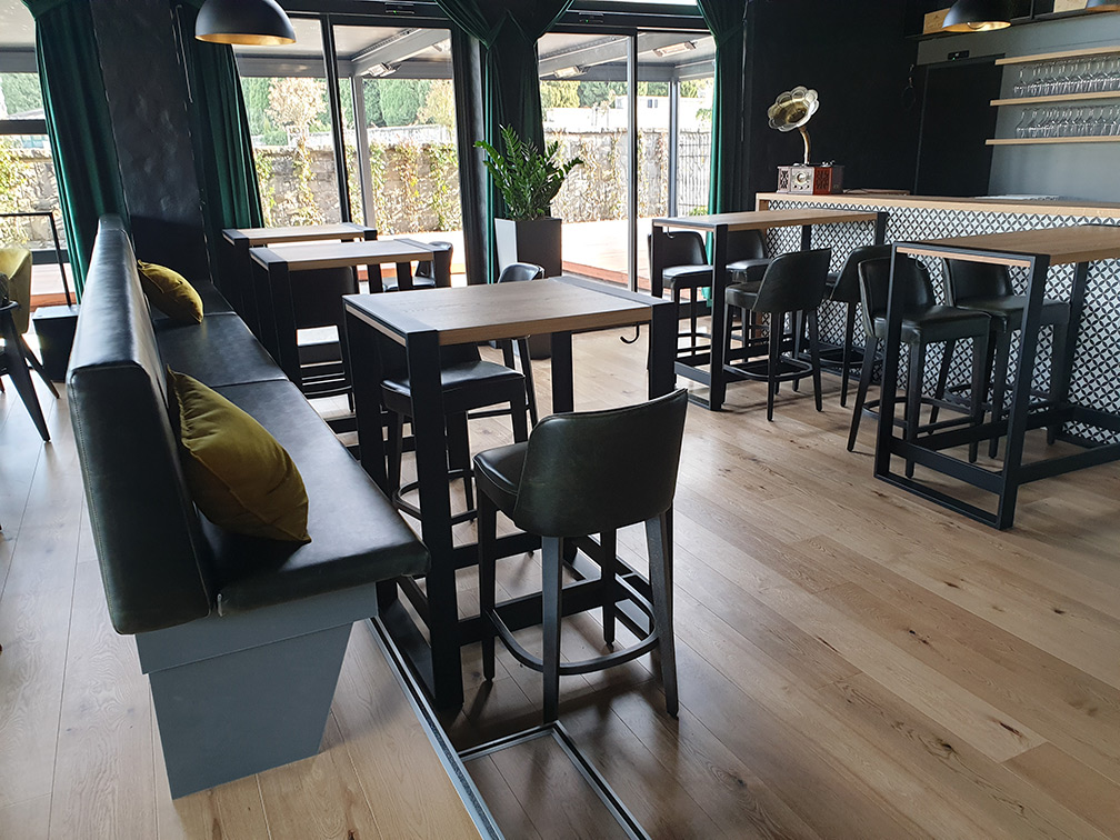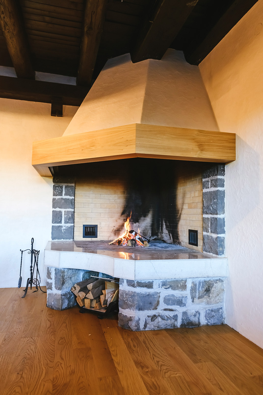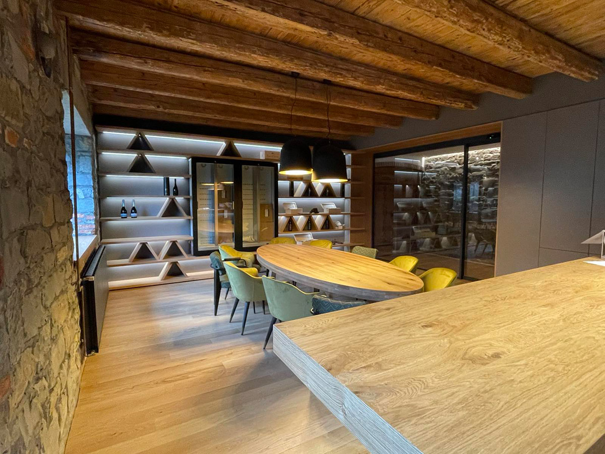 Dovršena kombinacija istrskega kamna in hrastovega pohištva povsem usklajena s hrastovim parketom.